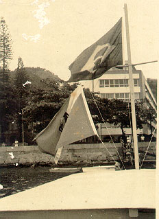 Vista superior da Baleeira utilizada pelo CBD para preparação de atletas, destacando-se a bandeira do Clube tremulando sempre ao lado da de nossa Pátria em primeiro plano e ao fundo o prédio da esquina da Rua Cândido Gaffrée onde o CBD tem seu endereço de referencia, com Av. João Luiz Alves, altura do nº 338. Nota-se que o cáis de cimento hoje existente no local nessa época era inexistente , só tendo sido construido posteriormente , para o que muito contribuiu o Dr. Eduardo Paim Bracony , membro de uma das mais antigas e tradicionais familias da Urca (um dos sócios-fundadores de do CBD e primeiro professor da Escola) e de alguns Pescadores tradicionais do local que hoje também integram o Quadro de Atletas de do Clube. Para fins históricos , os primeiros documentos oficiais que reconhecem sua existência são: 1 - DATA 14/11/1975 = Oficio 6445 da Capitania dos Portos do Estado do Rio de Janeiro autorizando o CBD a utilizar o trecho fronteiro ao nº 338 para preparação de seus atletas-mergulhadores e pescadores) e a "preservar" a área cimentada .