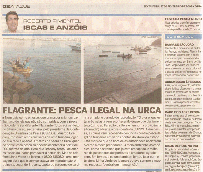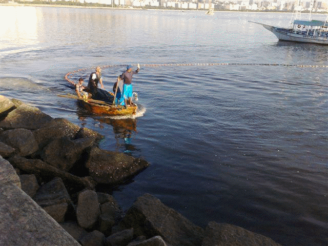 07/03/2009 Estão continuando a pesca predatória - o barco "mãe" novamente na área coordenando o trabalho de pequenos barcos de apoio que cercavam os cardumes de sardinhas próximos da orla e em sucessivas viagens entregavam o produto de sua reprovavel ação ao barco principal cujo nome é SINAL DA CRUZ. Agora iniciam por volta de 06:00 h porque sabem que a Fiscalização está desativada nesse horário e o telefone da Linha verde do IBAMA acionado as 07:15 informava que o Serviço só funciona após as 08:00 h e até as 18:00 h. PREDAÇÃO AO AMANHECER - Retiraram-se após as 08:00 h para os lados de Jurujuba . PREDAÇÃO AO ANOITECER - No mesmo dia voltam as 17:00 h, e soltam seus barcos auxiliares para localizarem na orla da Urca, da Fortaleza São João (ALÔ EXERCITO DE QUE VALE O AVISO PARA MANTER DISTÂNCIA DE SUAS UNIDADES APLICAVEL ÀS EMBARCAÇÕES QUE NÃO PORTAM HASTEADA A BANDEIRA FORNECIDA POR SEUS COMANDOS QUE AS AUTORIZA A TRANSITAR E FUNDEAR NESSAS ÁREAS DE SEGURANÇA NACIONAL ???) -