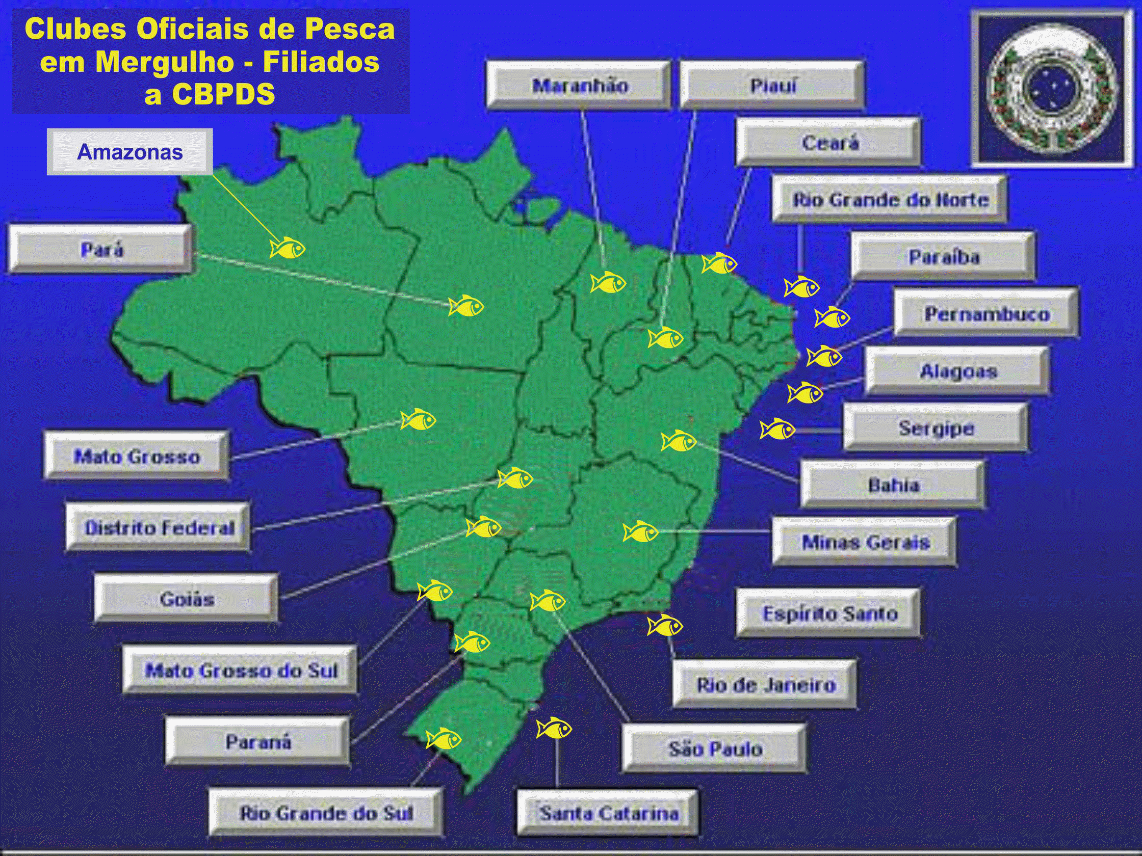 " Clique no Estado que quer visitar, conheça os Clubes de Pesca através dos quais você poderá chegar as Seleções Brasileiras, acesse os que estiverem na internet por terem suas páginas de conformidade com o aprovado pela CBPDS /ProAcqua e veja suas atividades" |